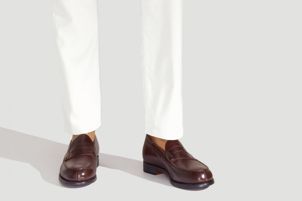 For casual wear, loafers and the smart-casual dress code go hand in hand. Penny loafers are your go-to here, pairing just as well with cuffed chinos as they do with dark denim. Tassel loafers or horsebit styles lean slightly dressier—perfect with slim-fit trousers, a lightweight blazer, and a clean button-down shirt. When you’re dressing for semi-formal occasions, consider dark trousers, neatly pressed pleated chinos, or suit-style pants cut with a straight leg. The hem should break just above the loafer, allowing the shoe to stand out without being swallowed by fabric. This small detail can make a world of difference in keeping your look sharp and intentional.