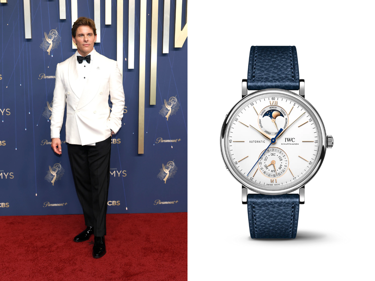 On the Emmys red carpet, amidst a mix of bold statement pieces and six-figure complications, one watch distinguished itself through its understated elegance: the IWC Schaffhausen Portofino Complete Calendar. Worn by James Marsden, this 41 mm stainless steel watch features a simple, silver-plated dial with well-proportioned subdials for the date, day, month, and moon phase. It exudes a subtle sophistication rather than an obvious flash, making it ideal for Marsden’s polished appearance. Priced at around $10,700 USD, it strikes a balance—proving that timeless style can be accessible without reaching into the six-figure range.