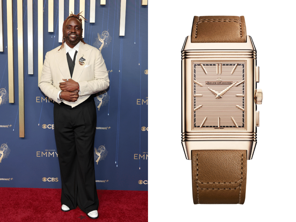 Nominated for his role in Dope Thief, Brian Tyree Henry brought some serious horological heat to the Emmys red carpet, pairing his neutral-hued jacket with the Jaeger-LeCoultre Reverso Tribute Chronograph (Ref. Q389256J) in 18-karat pink gold. The actor chose one of the most versatile watches out there, a timepiece with two faces and two personalities. On one side, you have the golden dial with its refined railroad minute track—a nod to the timeless Reverso design. Flip it over, and you’re greeted with an open-worked view of the Calibre 860 and retrograde chronograph, complete with a 52-hour power reserve that makes it both practical and stunning. Sitting on a sleek black alligator strap, it was the perfect mix of elegance and edge, showing that Henry knows how to make a statement without saying a word. Prices for the model are available upon request.