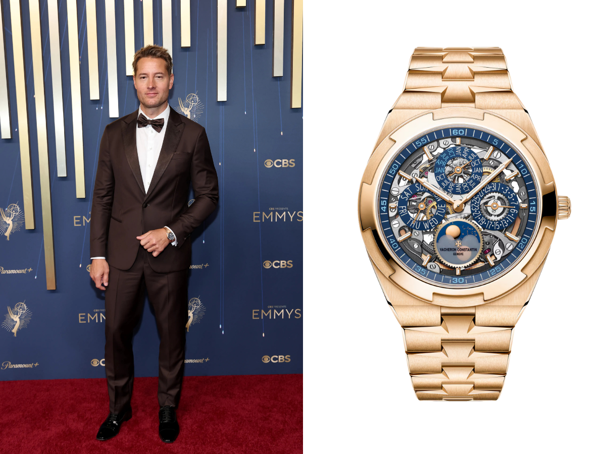 Justin Hartley finished the night in refined style, hopping on the Vacheron Constantin train with an Overseas Perpetual Calendar Ultra-Thin Skeleton (Ref. 4300V/220R-B642). Crafted in 18-karat pink gold with striking blue accents, this fully skeletonized masterpiece offers a clear view of its inner workings, powered by the Calibre 1120/3 QPSQ/1. The watch features a moon phase complication decorated with stars and twin moons, set within a 41.5 mm case that balances elegance with technical brilliance. Add in the beautifully finished bracelet, and you have a timepiece that’s as much a work of art as it is a watch. Price? Available upon request—because, truly, if you have to ask, it might not be in your cart just yet.