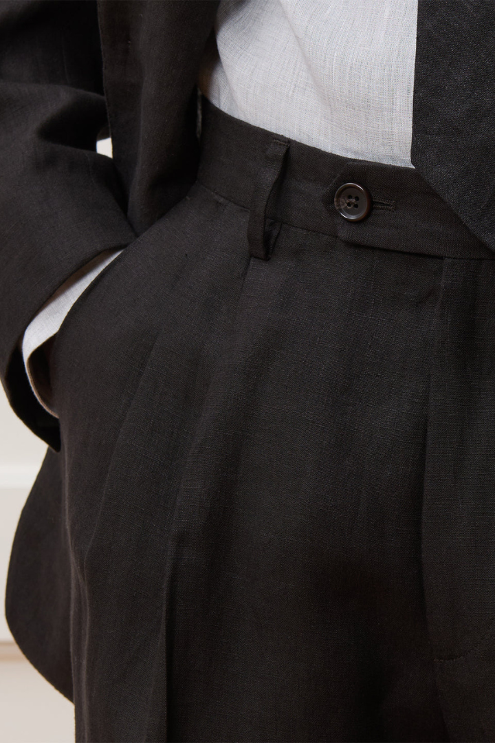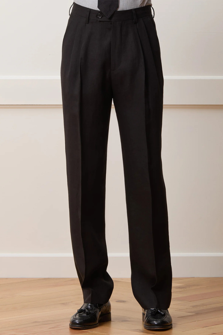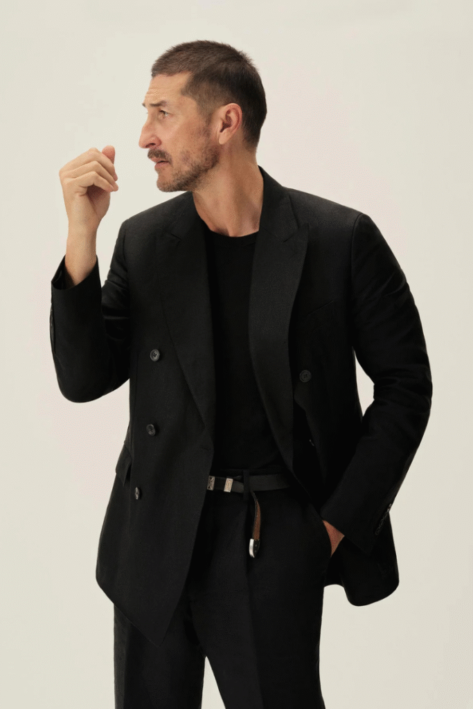 Designed in black, it immediately stands out as a confident choice for summer evenings when you want something sharper than the usual light neutrals. The double-breasted blazer adds a touch of vintage charm, while the relaxed tailoring keeps it from feeling stuffy. It’s linen at its most refined—breathable, lightweight, and built to handle warm nights without breaking your stride.