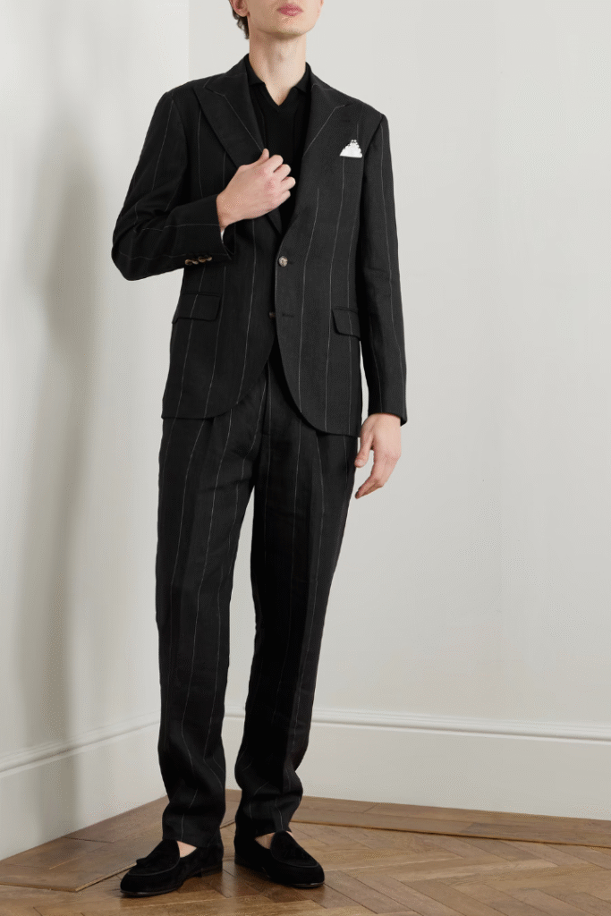 Brunello Cucinelli knows how to take a staple and make it extraordinary, and his Pinstriped Linen Suit in black is a perfect example. Made from lightweight, breathable linen, the suit keeps you cool without losing any of its elegance. The subtle pinstripes add depth to the fabric, offering a touch of classic tailoring flair while keeping the overall look modern and sharp. It’s a true Italian classic at its finest—structured enough to appear polished, yet light enough to stay comfortable in summer.