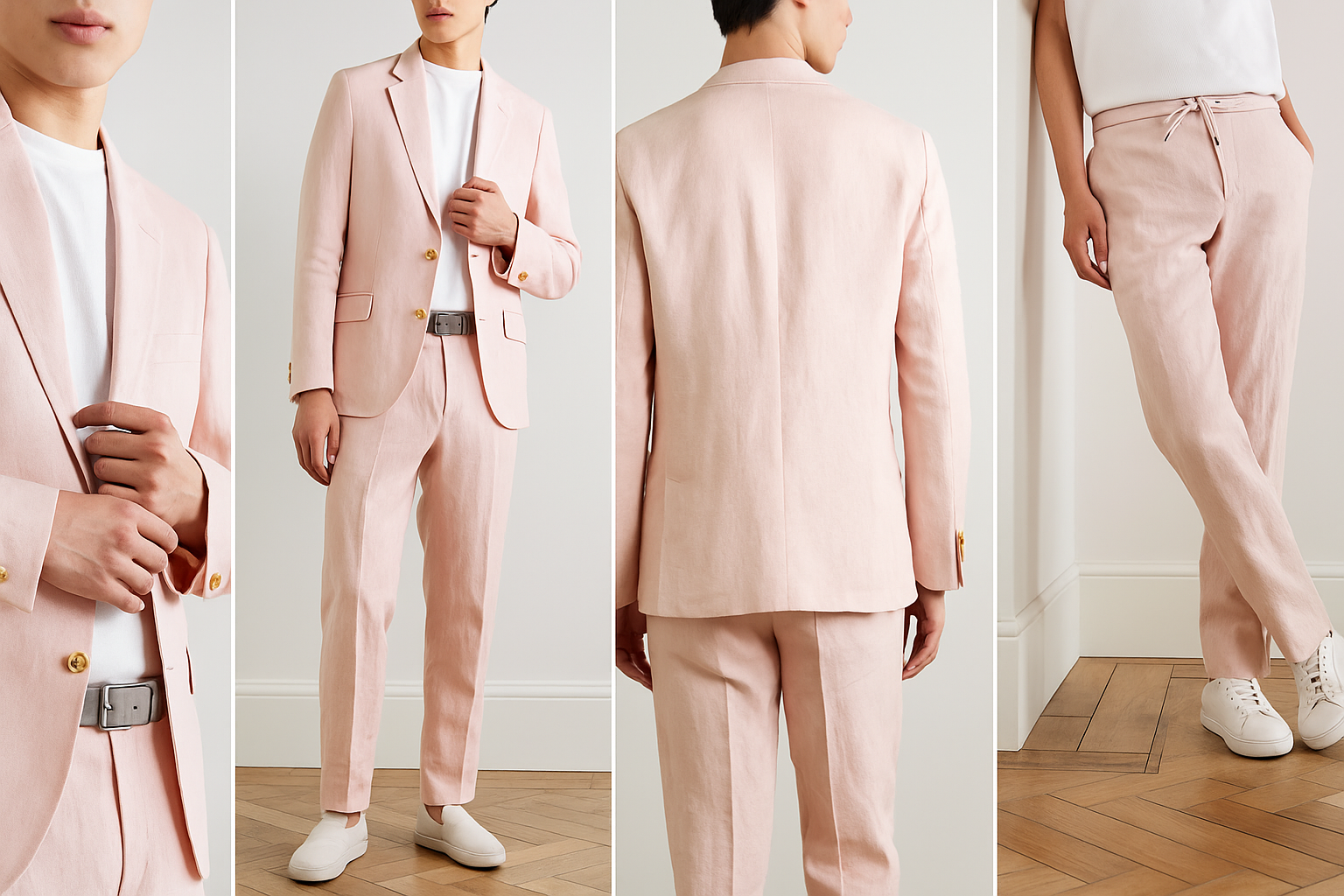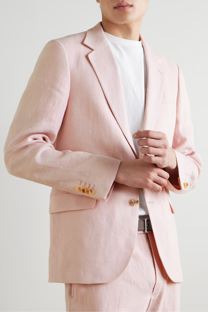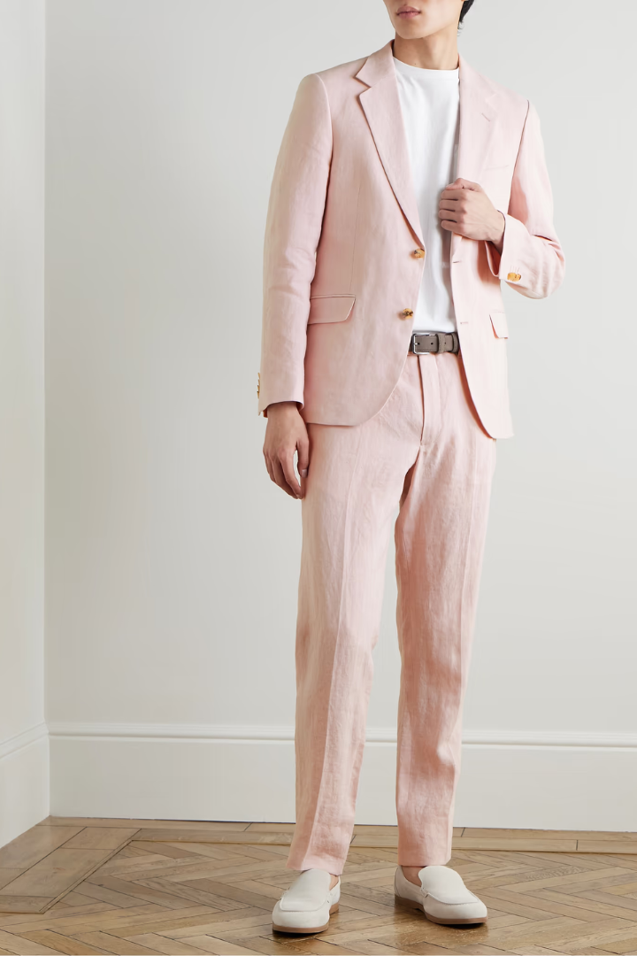 What makes this suit stand out is the colour itself. The soft pink shade adds personality without ever crossing into loud territory, striking the perfect balance of playful and polished. The slim fit keeps the look modern, while the linen fabric ensures it remains breathable and easy to wear all day. It’s the kind of suit that makes an impression without trying too hard—a stylish reminder that stepping outside the navy-and-grey box is worthwhile.