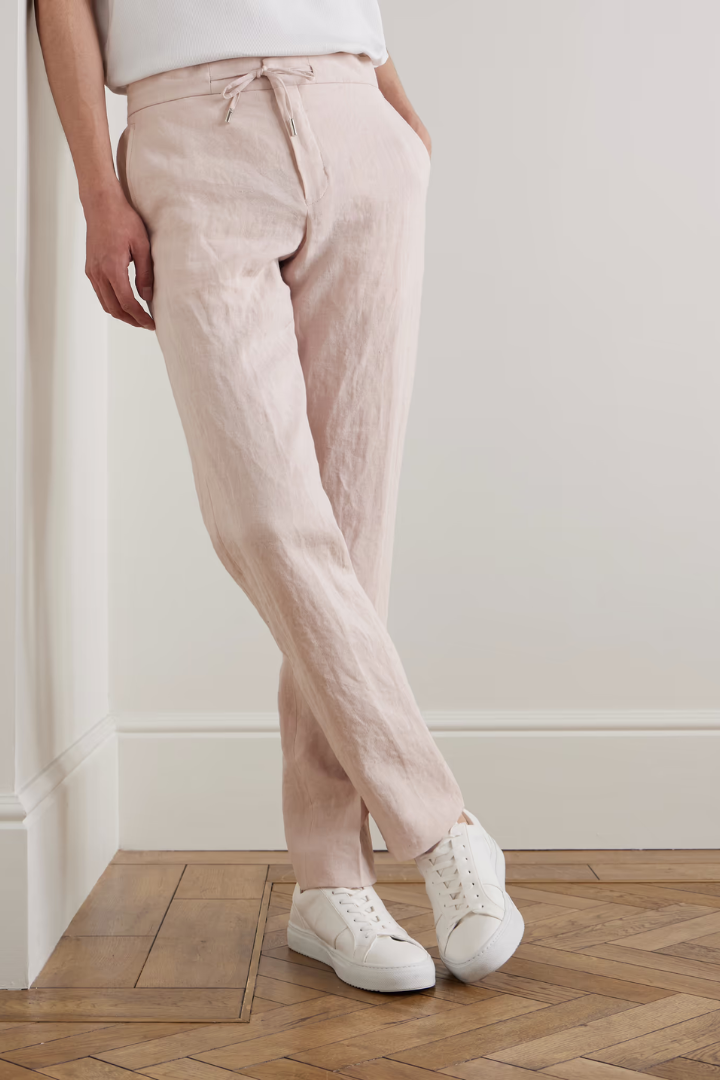 Keep it light and simple. A crisp shirt or even a T-shirt works with linen, and loafers or clean sneakers keep the look relaxed but refined. You can also dress it up with a tie for more formal settings.