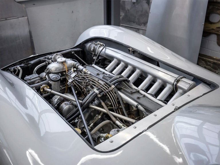 Beneath the sleek skin sat an inline eight-cylinder engine, essentially two four-cylinder units bolted together, producing between 257 and 290 horsepower depending on its race setup. Pair that with innovations like front double wishbone suspension, torsion-bar springs, Alfin drum brakes, and Uhlenhaut’s patented low-pivot swing axle rear suspension, and you had one of the most advanced racing cars of its era. This wasn’t just a car—it was a rocket ship in disguise.