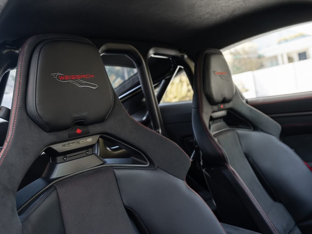Speaking of seats, the bucket seats are amazing in their carbon-fibre shells, and they do belong to the pit lane. You’ll be surprised at how comfortable it is once you settle in. You can adjust the height electrically, slide them manually, and even add heating—all the features you’d expect are included. I’m even impressed by how Porsche considered helmet use, allowing part of the headrest padding to be removed so your seating position stays natural on track days.
