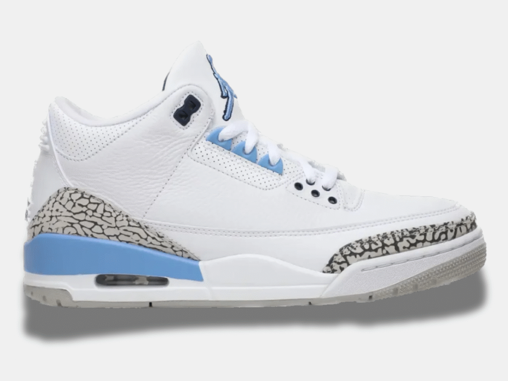 Paying homage to Michael Jordan’s college days at the University of North Carolina, the Air Jordan 3 Retro ‘UNC’ was released in 2020 and quickly became one of the cleanest modern takes on the classic silhouette. The white tumbled leather base is highlighted with soft valor blue details, elephant print overlays, and subtle branding hints that connect to Jordan’s Tar Heel roots. Although it wasn’t tied to a specific on-court moment, the ‘UNC’ 3 quickly earned a place among fan favourites thanks to its versatility — crisp enough to dress up, bold enough to stand out, and rich in nostalgia for the place where MJ’s journey to greatness began.