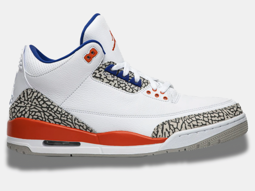 The Air Jordan 3 Retro ‘Knicks’ dropped in 2019 as a tribute to one of Michael Jordan’s fiercest rivals—the New York Knicks. Featuring a sleek white leather upper with elephant print overlays, the sneaker stands out with royal blue and orange accents that pay homage to the Knicks’ iconic team colours. While Jordan frequently disappointed New York fans at Madison Square Garden, including some of his most memorable performances, this colour-way switches the narrative, honouring the rivalry that helped define his legacy. It’s a retro that blends history with style, offering fans a sneaker that is as bold and competitive as the matchups that inspired it.