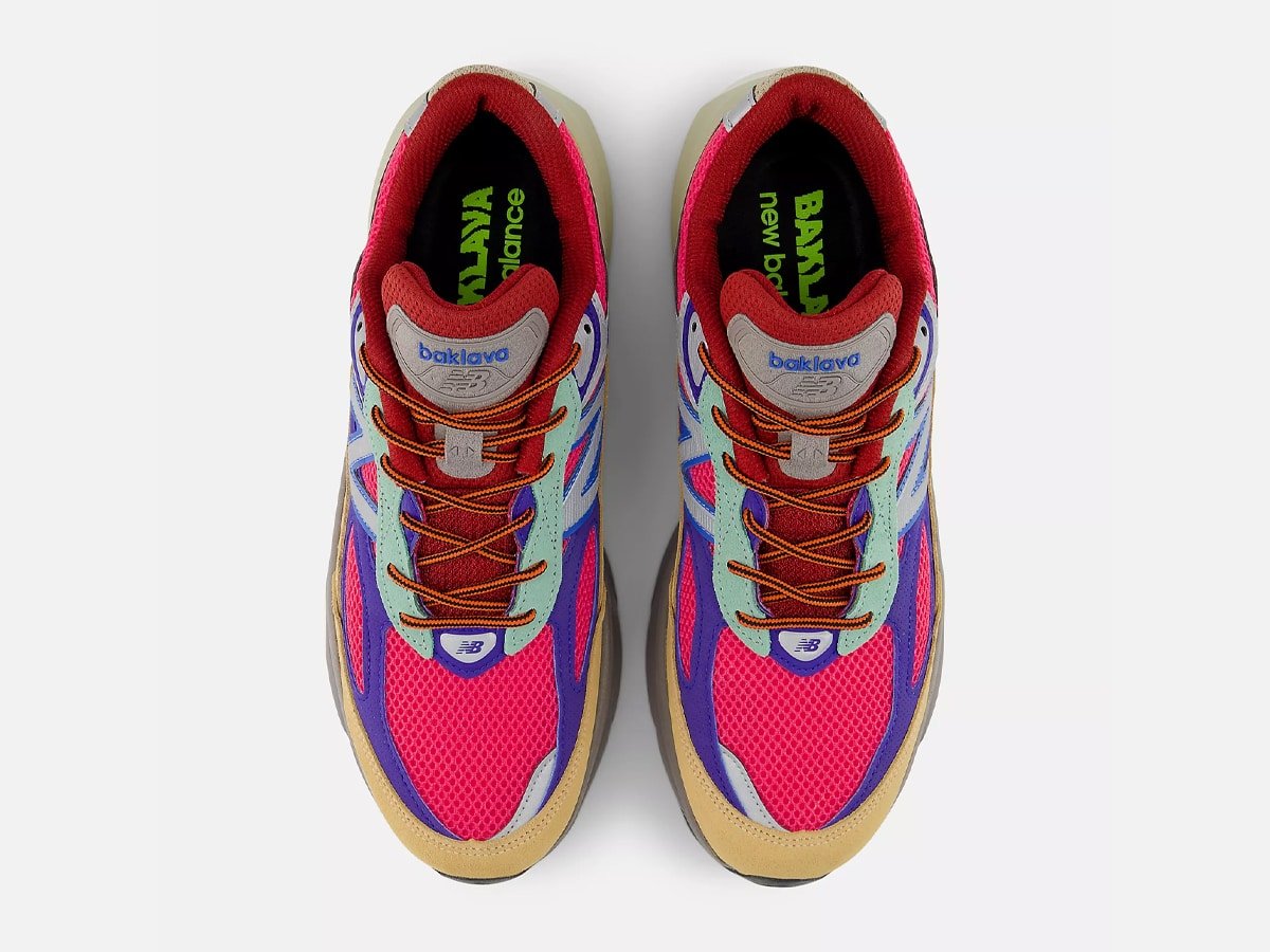 Much of the shoe’s character comes from how colour and material are layered rather than simply applied, with classic greys and muted beige tones appearing along the outsole to balance the brighter elements above. Bronson’s signature details are integrated in a way that feels personal rather than performative, from the familiar Baklava-branded tongue badge and co-branded sock liner to the mix of nubuck overlays, mesh panels, and synthetic underlays that add texture and depth while maintaining the clean proportions of the 990v6 silhouette.