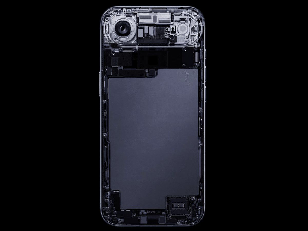 The iPhone Air’s plate is sculpted to fit the custom cameras, speaker, and Apple silicon, dedicating more space to the battery.| Image: Apple