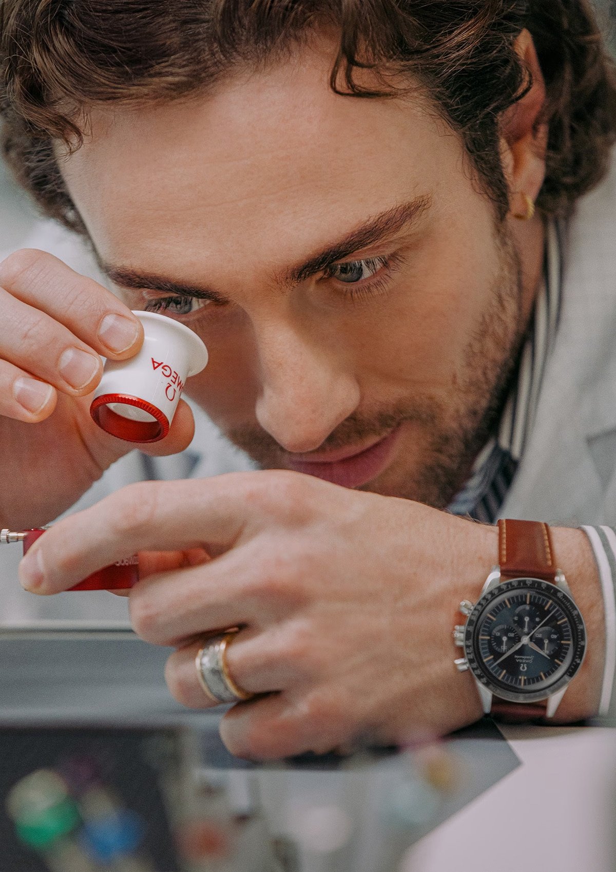 To celebrate the collaboration, OMEGA released a series of photographs that went beyond just confirming a contract. They featured Aaron Taylor-Johnson inside the brand’s inner sanctuary — walking through the manufacturing facility, examining the archives, and absorbing the history of decades of innovation. This imagery was meant to evoke a feeling of belonging. Not an outsider borrowing a watch, but someone being welcomed into the story.
