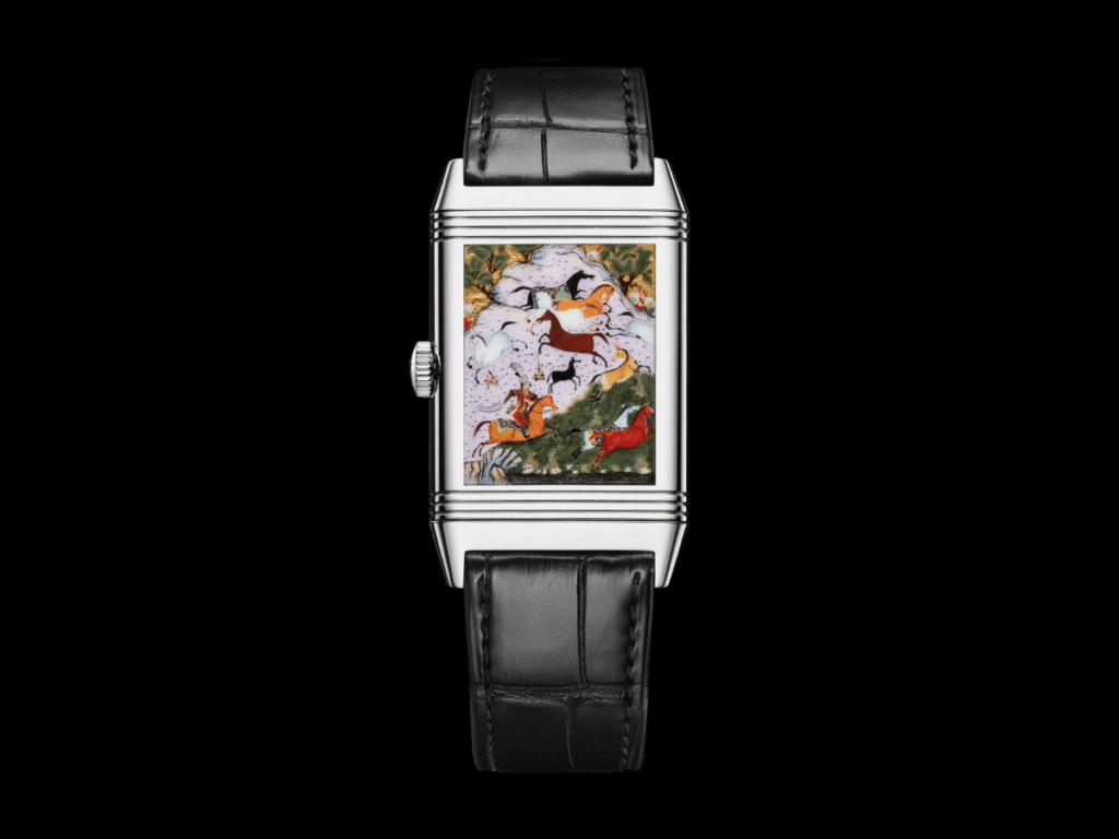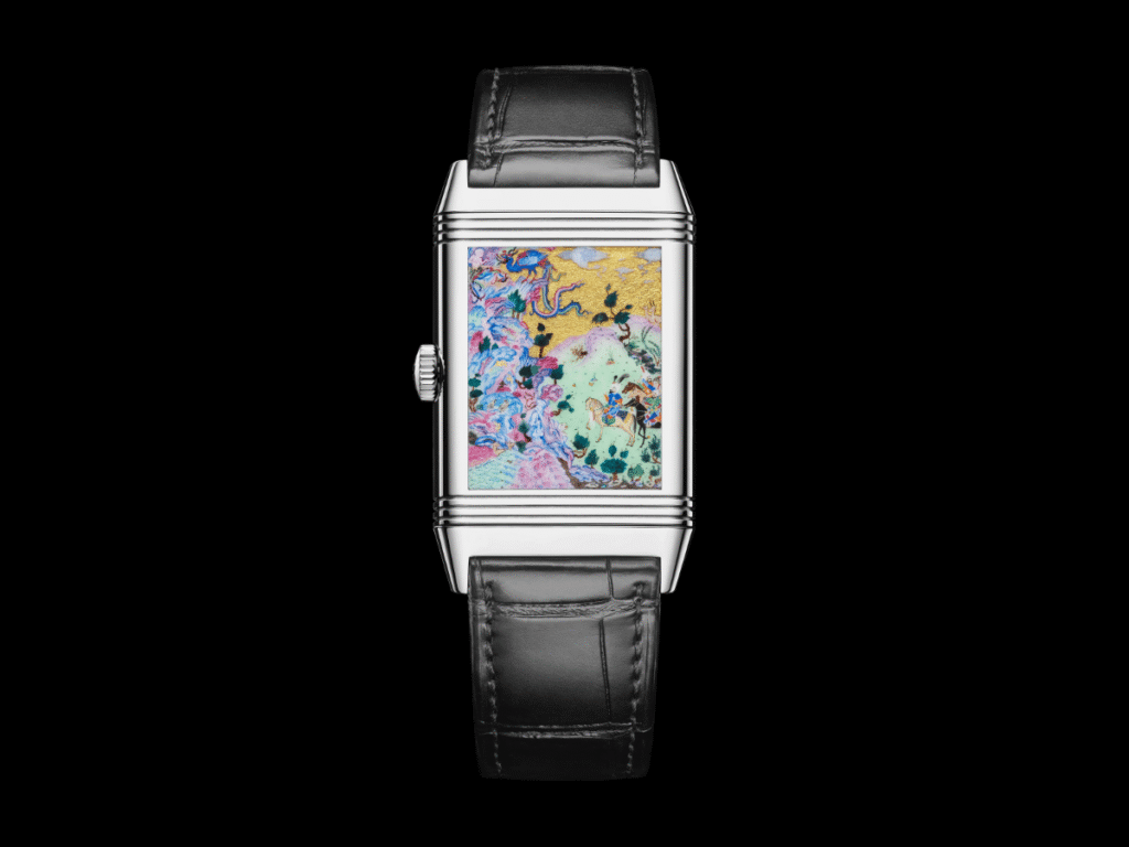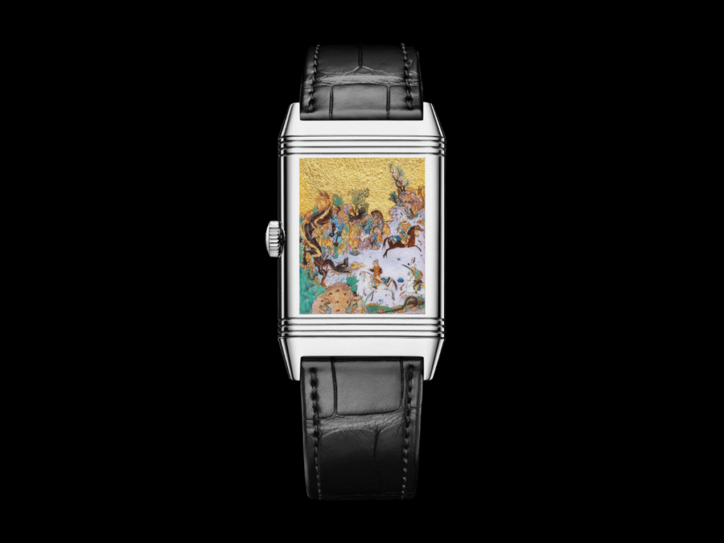 On the front, each watch showcases a refined dial adorned with intricate guilloché patterns, protected by a smooth layer of Grand Feu enamel in subtle, elegant tones. Flip the Reverso over, and the caseback transforms into a canvas: a vivid, miniature enamel painting crafted entirely by hand. These artworks demand over 100 hours to complete and require an extraordinary level of precision to bring the characters and settings of Persian mythology to life.