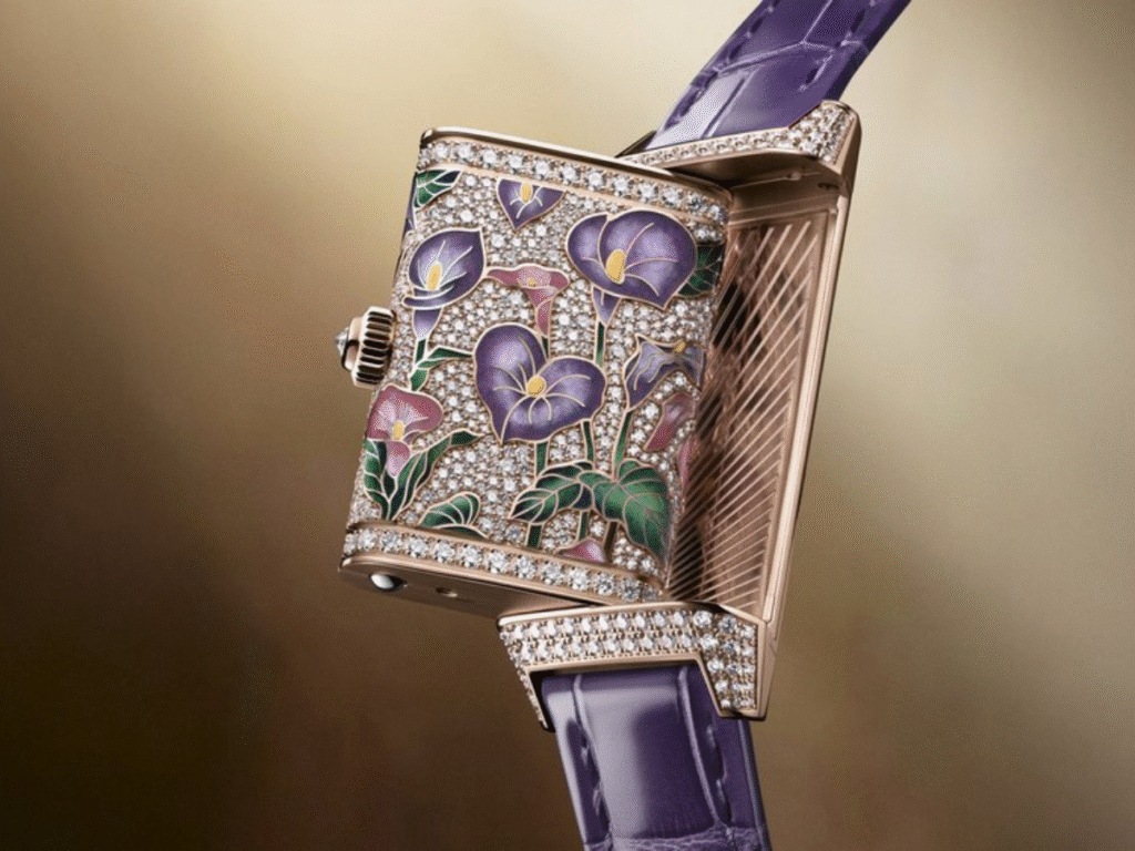 Surrounding the enamel scene features 637 brilliant-cut diamonds, set using a mix of grain and snow-setting techniques that shimmer and shift with every movement. Paired with a shiny purple alligator strap and powered by the Calibre 846 manual movement, this Reverso isn’t just a timepiece — it’s a statement of beauty, craftsmanship, and floral elegance on the wrist.
