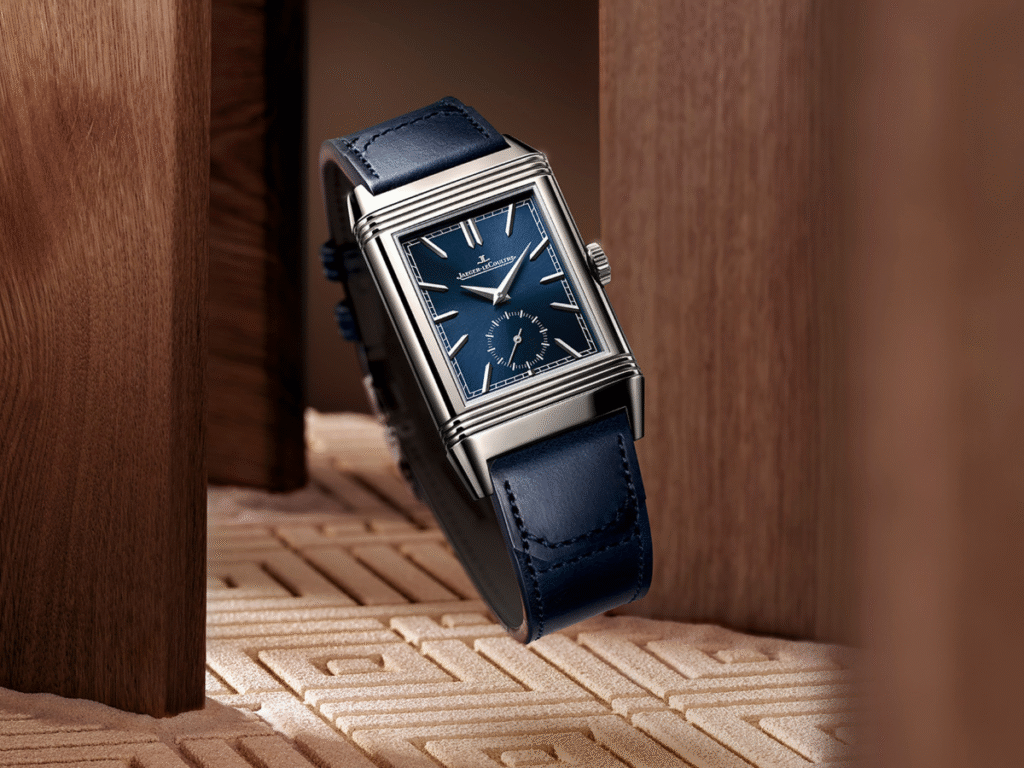 It starts with the dial — or rather, the first one. A rich, sunray-lacquered blue that shifts in the light, framed by a clean railroad minute track and accented with sharp Dauphine hands. The trapezoidal markers and the small seconds at 6 o’clock feel as though they were lifted straight from the 1930s, but there’s nothing outdated about how it all comes together. It’s refined and grounded, like the Reverso itself.