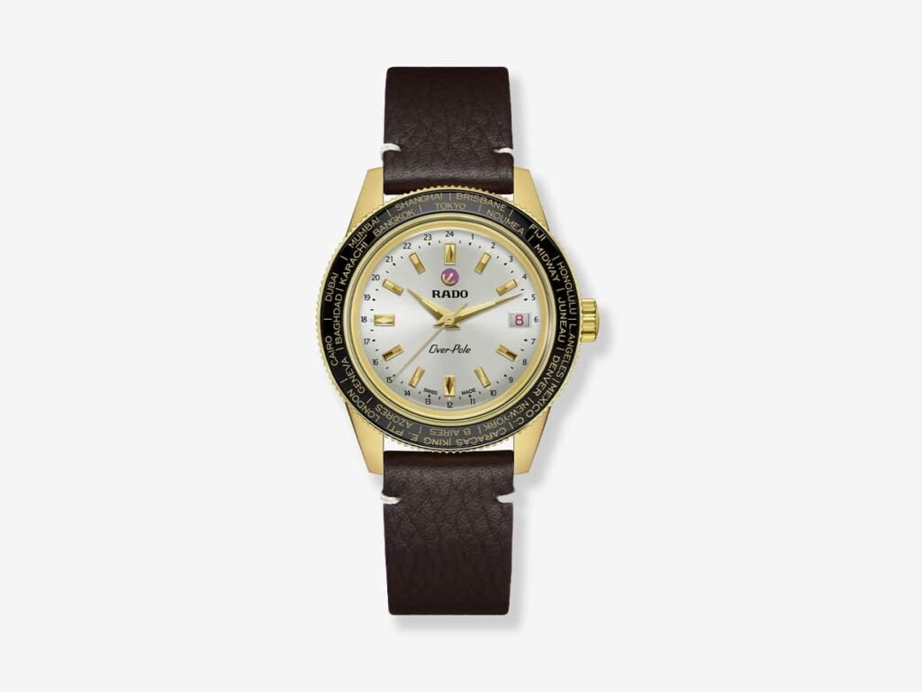 The completion features a polished and brushed rice-grain-style bracelet in yellow gold PVD stainless steel, secured with a triple-fold clasp for everyday reliability. For those seeking a more adventurous look, the included brown vintage-style leather strap transforms the watch’s overall vibe. Paired with warm gold tones and a silver sunray dial, the leather option leans towards a rugged, travel-ready style, perfectly capturing the spirit of the Over-Pole as a worldtimer designed for exploration.