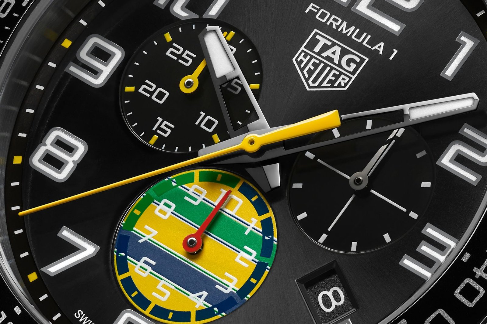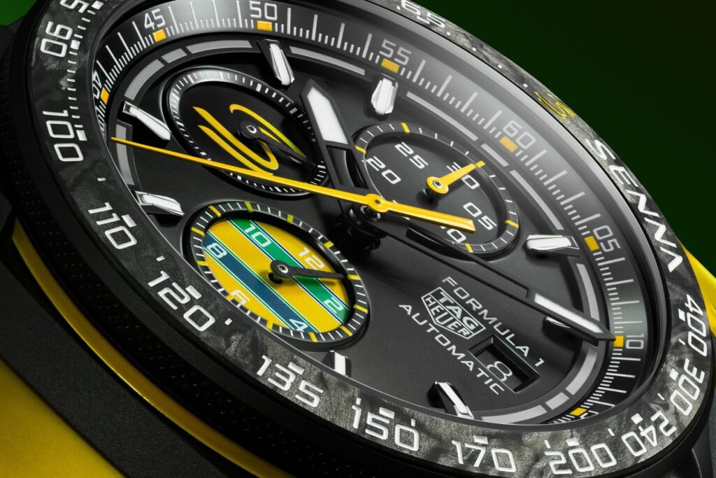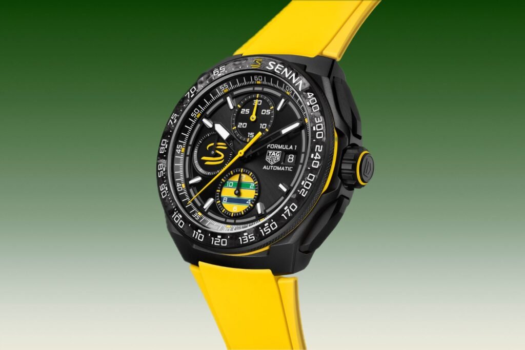 The 44mm Formula 1 Chronograph includes design elements inspired by Senna’s helmet and Brazilian heritage, with subtle flag details on the dial.