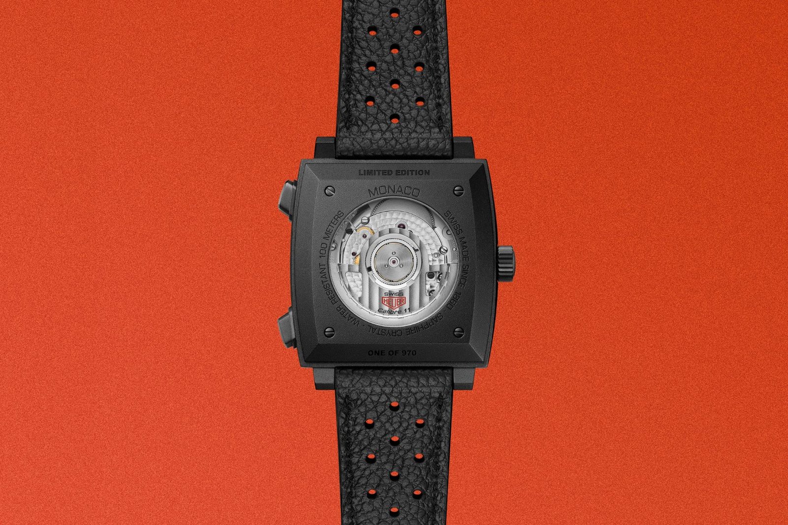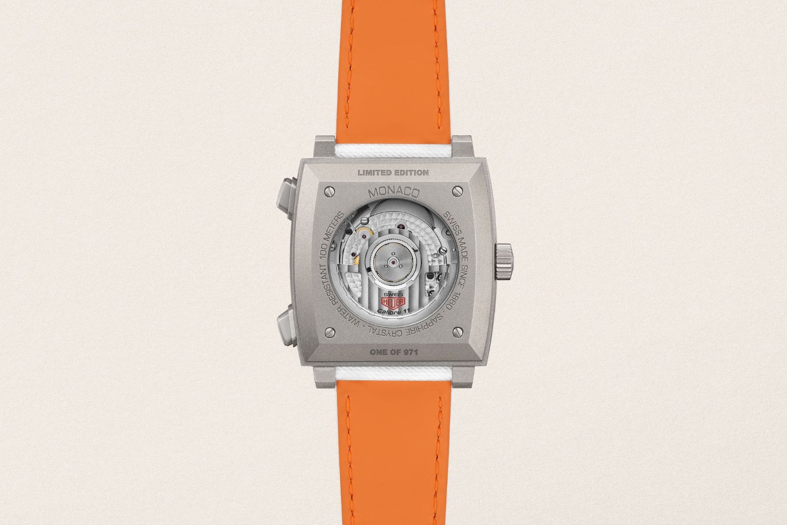The 39mm case is made from sandblasted grade-2 titanium, providing a matte, tactile finish that keeps the watch lightweight and modern while retaining the bold square shape that defines the Monaco. Through the sapphire caseback, the calibre 11 is visible again, showing hours, minutes, seconds, a date, and a chronograph, supported by a 40-hour power reserve.