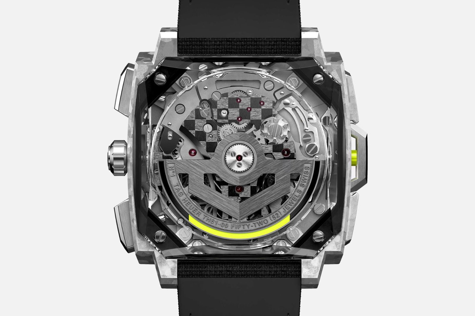 That wild, irregular backdrop offers the design team a perfect chance to embrace colour, and they do so by adding flashes of vivid lime green across the split-second hand, the dedicated pusher, and the chronograph indications. This splash of colour creates a contrast that immediately draws the eye to its mechanical core through the transparent dial. TAG Heuer maintains its racing heritage throughout the design, with hand-painted stripes resembling racing liveries, while the movement’s architecture showcases finely brushed surfaces, polished bevels, and an oscillating weight with unique numbering, all of which are evident if you take the time to explore the details.