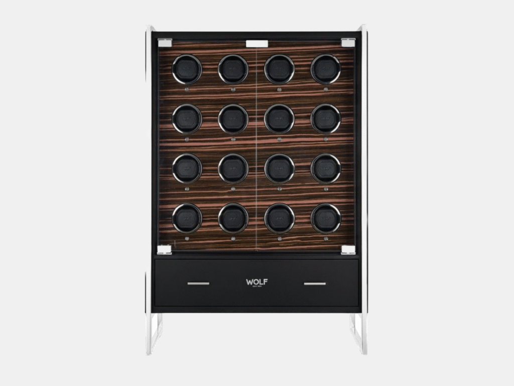 The Roadster 16. Piece Watch Winder Cabinet is designed for collectors who want their storage solution to be as eye-catching as their watches. Covered in pebble-grain vegan leather with Ebony Macassar wood panels and chrome accents, it exudes the sleek elegance of a classic British sports car, while the locking tempered glass doors turn it into a gallery-worthy display. Easily controlled through the WOLF1834 app, it offers Bluetooth connectivity that allows yours, customize settings, and even dim the LEDs at night for the ideal mood.