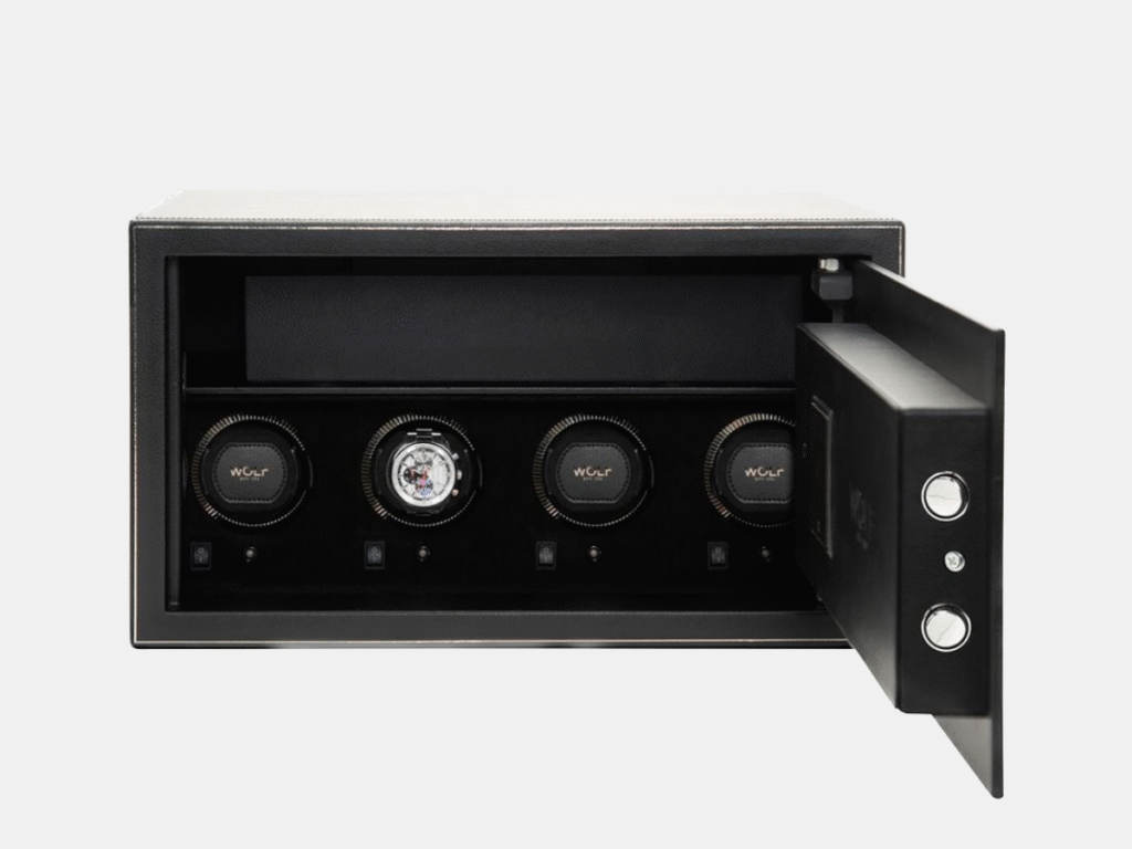 Each module can operate on AC power using the included universal adapter or on AA batteries—lithium options that last twice as long as alkaline—making it as versatile as it is secure. And with a price of USD $4,199.00, The Den 4 Piece Safe offers an accessible entry into WOLF’s world of high-security watch care, proving that true luxury lies in the details.