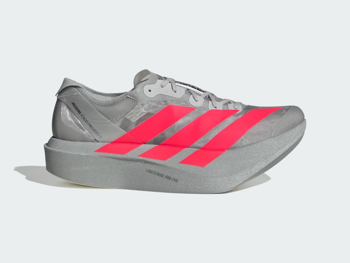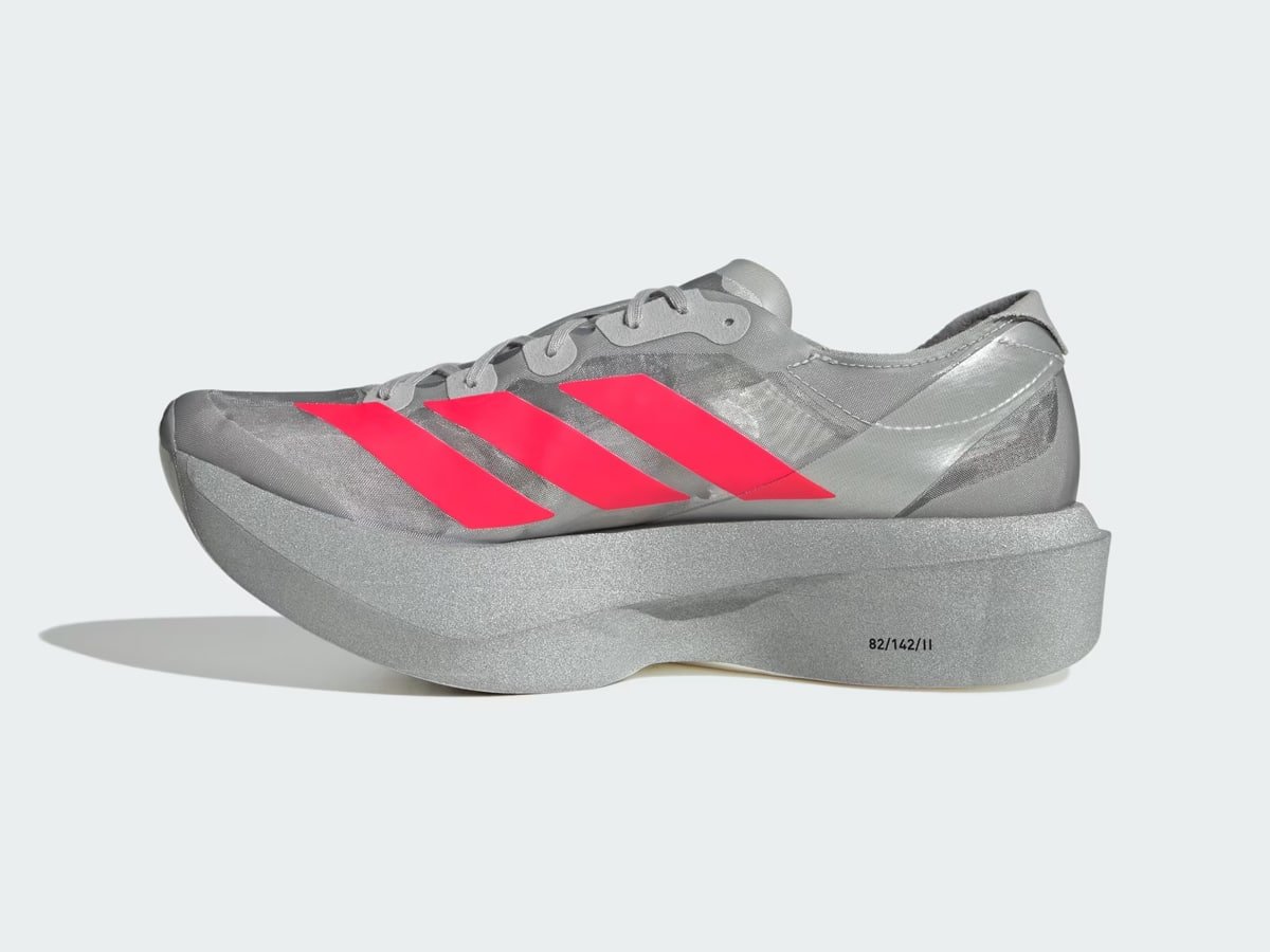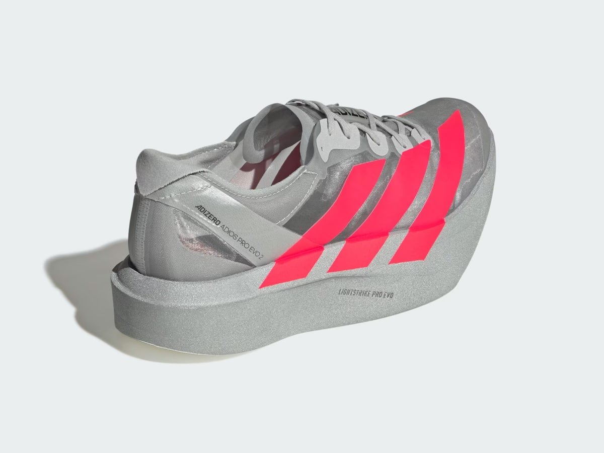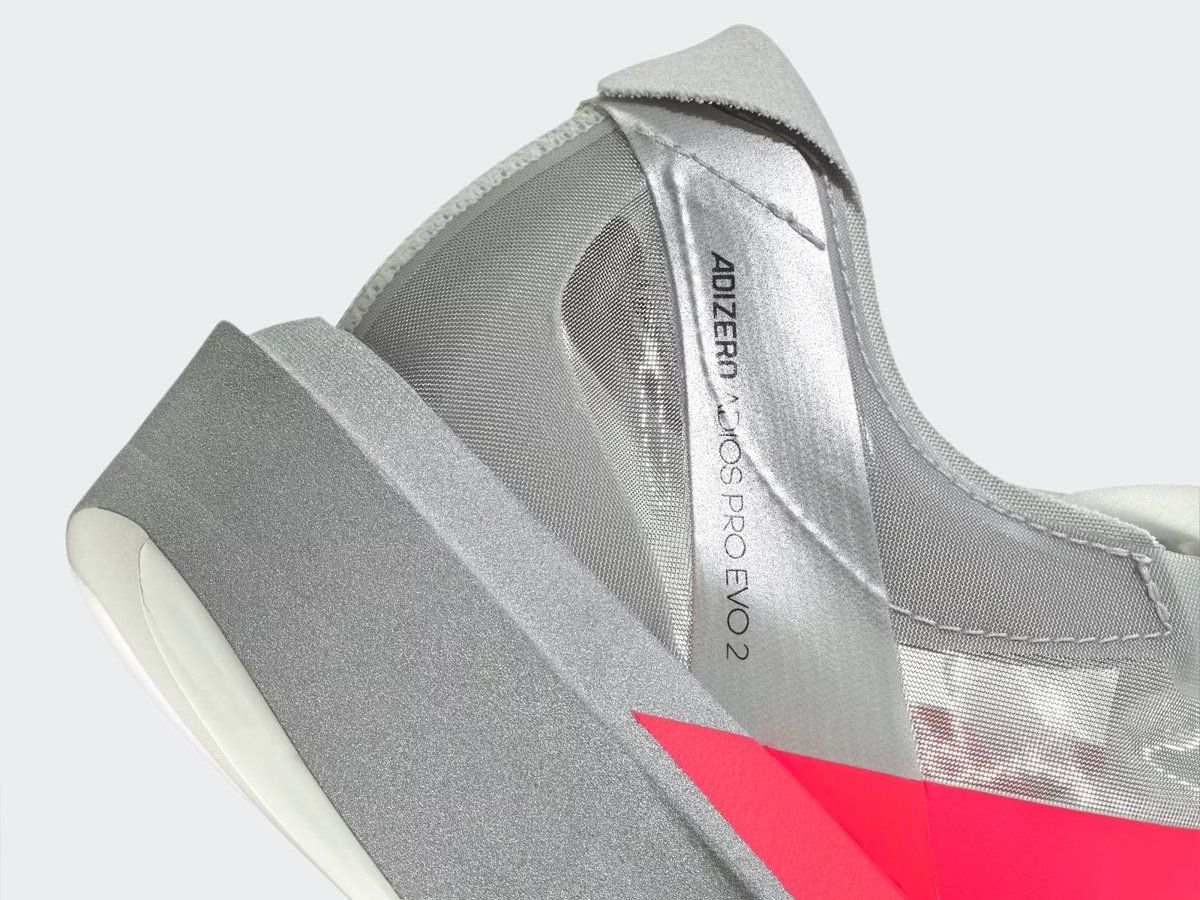 From a design perspective, the Adizero Adios Pro Evo 2 adopts a clear evolutionary approach rather than a radical redesign. A simple silver finish is paired with adidas’ signature red three stripes along both the lateral and medial sides, while branding remains intentionally subtle to keep the weight down. Small adidas script details appear on the midsole, tongue, and heel counter, where the shoe’s name is displayed, emphasizing the minimal, performance-focused ethos of the model.